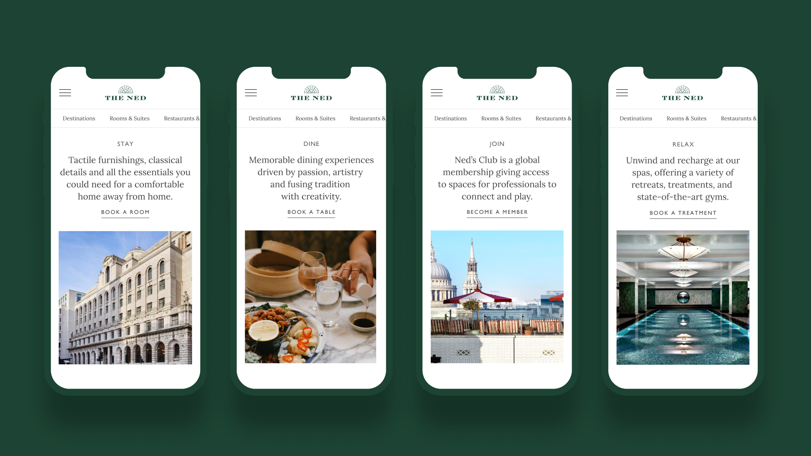 A global homepage and navigation reflecting The Ned’s luxury experience.
